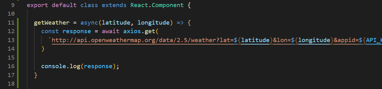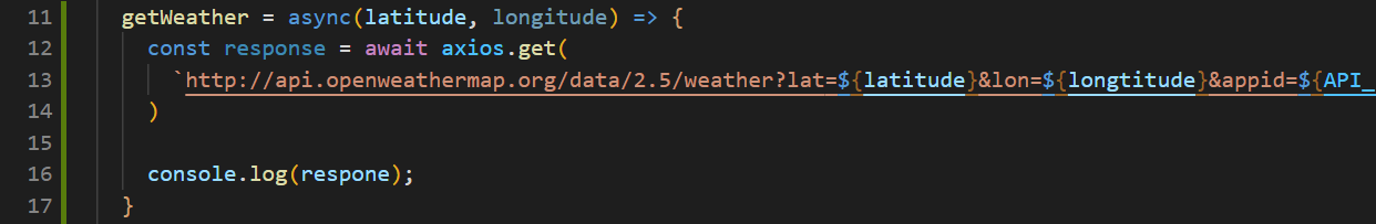 현재 위치를 받아온 후, api요청을 통해 현재 기상정보를 가져오기 위한 코드를 작성한다